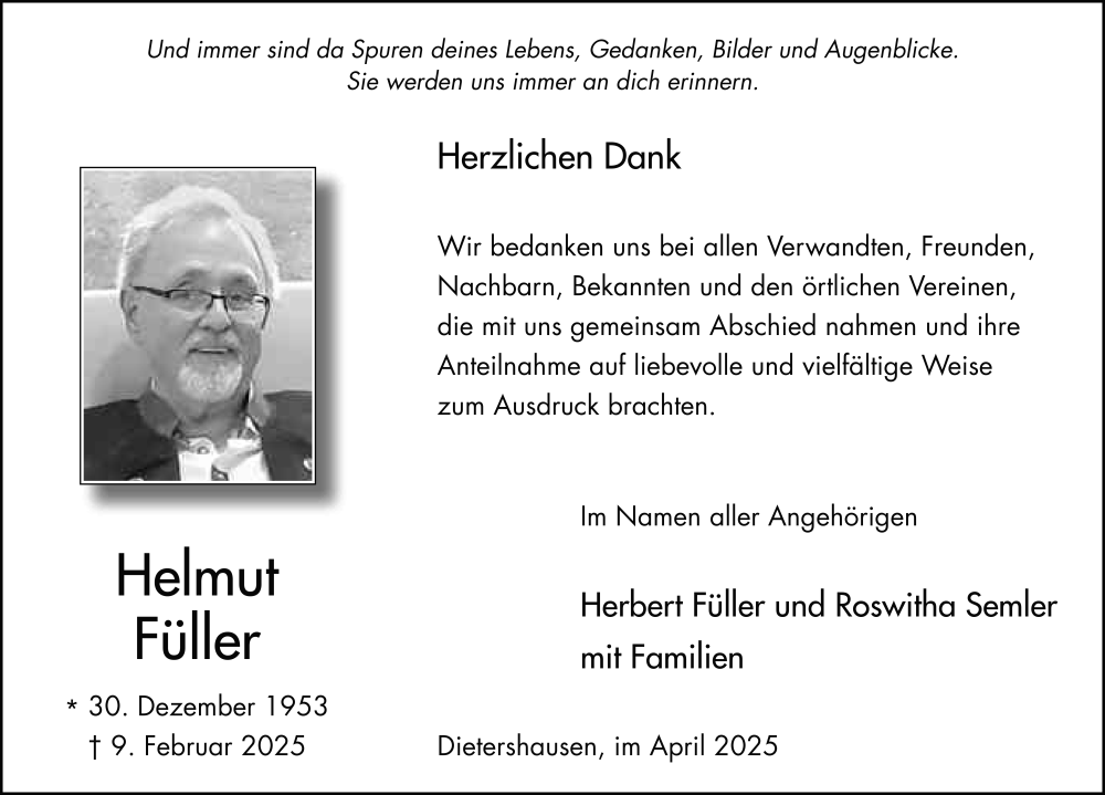 Hier finden Sie alle Traueranzeigen aus der Zeitung, die bisher für Helmut Füller erschienen sind. Weitere Traueranzeigen, die in der Zeitung erscheinen, werden hier ebenfalls aufgelistet