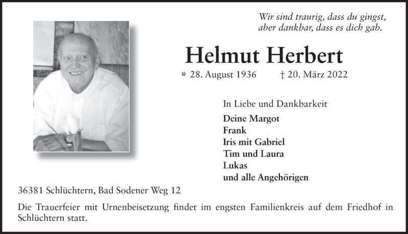 Hier finden Sie alle Traueranzeigen aus der Zeitung, die bisher für Helmut Herbert erschienen sind. Weitere Traueranzeigen, die in der Zeitung erscheinen, werden hier ebenfalls aufgelistet