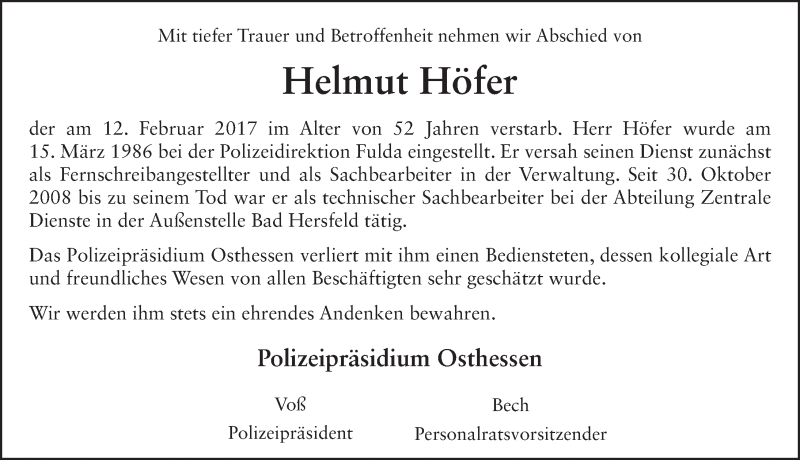 Hier finden Sie alle Traueranzeigen aus der Zeitung, die bisher für Helmut Höfer erschienen sind. Weitere Traueranzeigen, die in der Zeitung erscheinen, werden hier ebenfalls aufgelistet