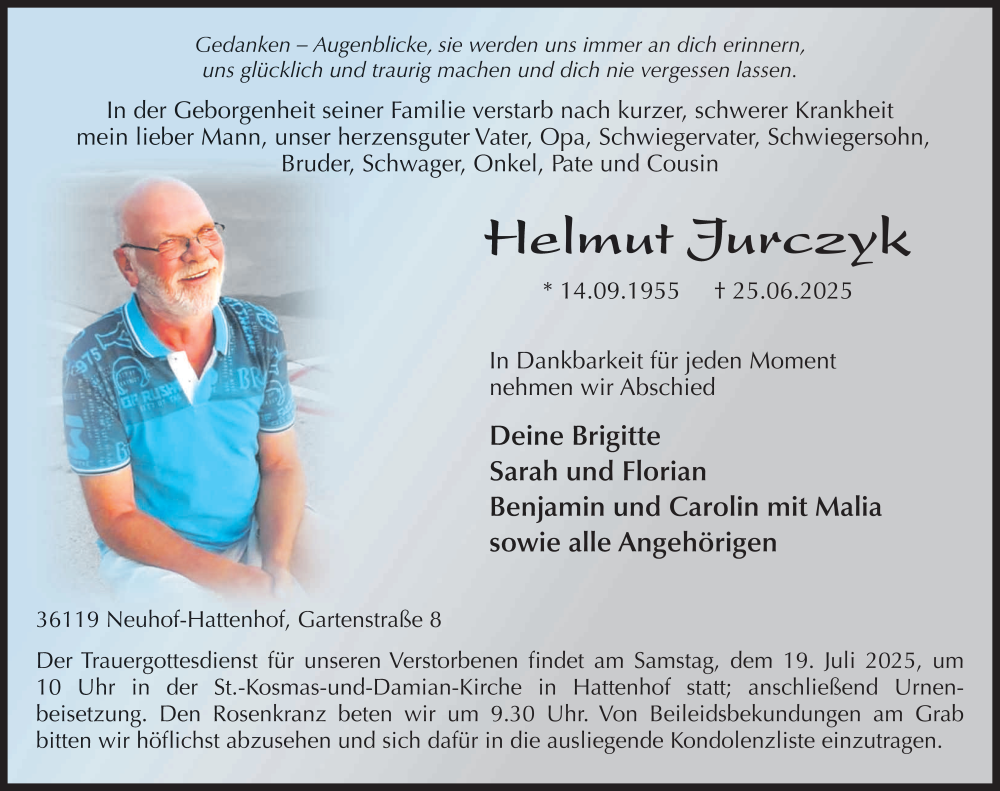 Hier finden Sie alle Traueranzeigen aus der Zeitung, die bisher für Helmut Jurczyk erschienen sind. Weitere Traueranzeigen, die in der Zeitung erscheinen, werden hier ebenfalls aufgelistet