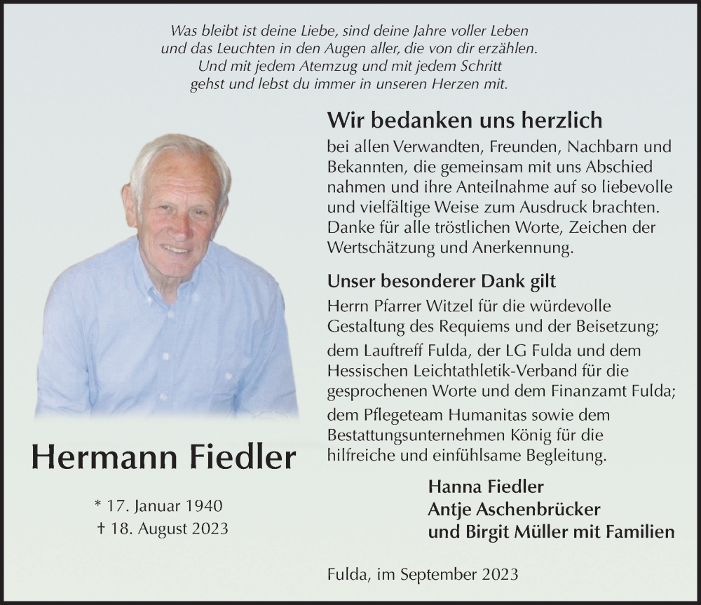 Hier finden Sie alle Traueranzeigen aus der Zeitung, die bisher für Hermann Fiedler erschienen sind. Weitere Traueranzeigen, die in der Zeitung erscheinen, werden hier ebenfalls aufgelistet