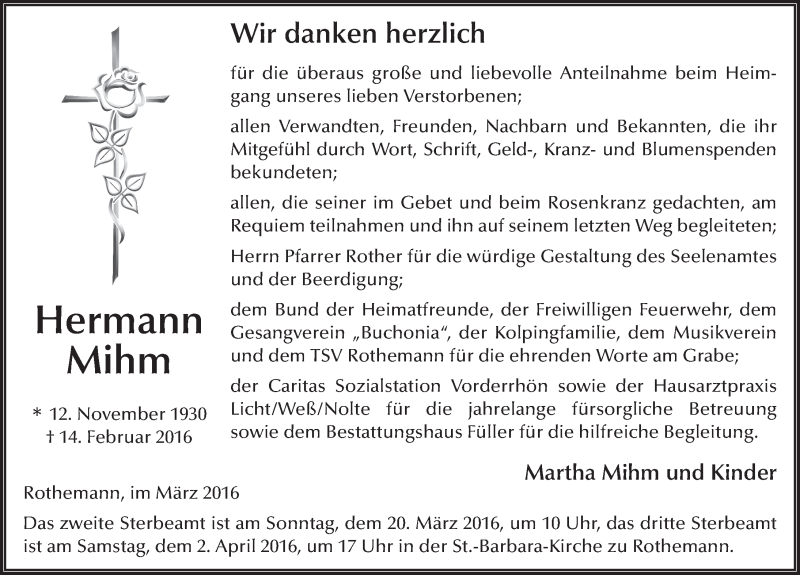 Hier finden Sie alle Traueranzeigen aus der Zeitung, die bisher für Hermann Mihm erschienen sind. Weitere Traueranzeigen, die in der Zeitung erscheinen, werden hier ebenfalls aufgelistet