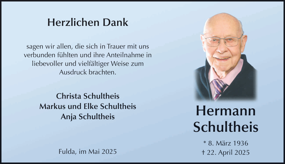 Hier finden Sie alle Traueranzeigen aus der Zeitung, die bisher für Hermann Schultheis erschienen sind. Weitere Traueranzeigen, die in der Zeitung erscheinen, werden hier ebenfalls aufgelistet