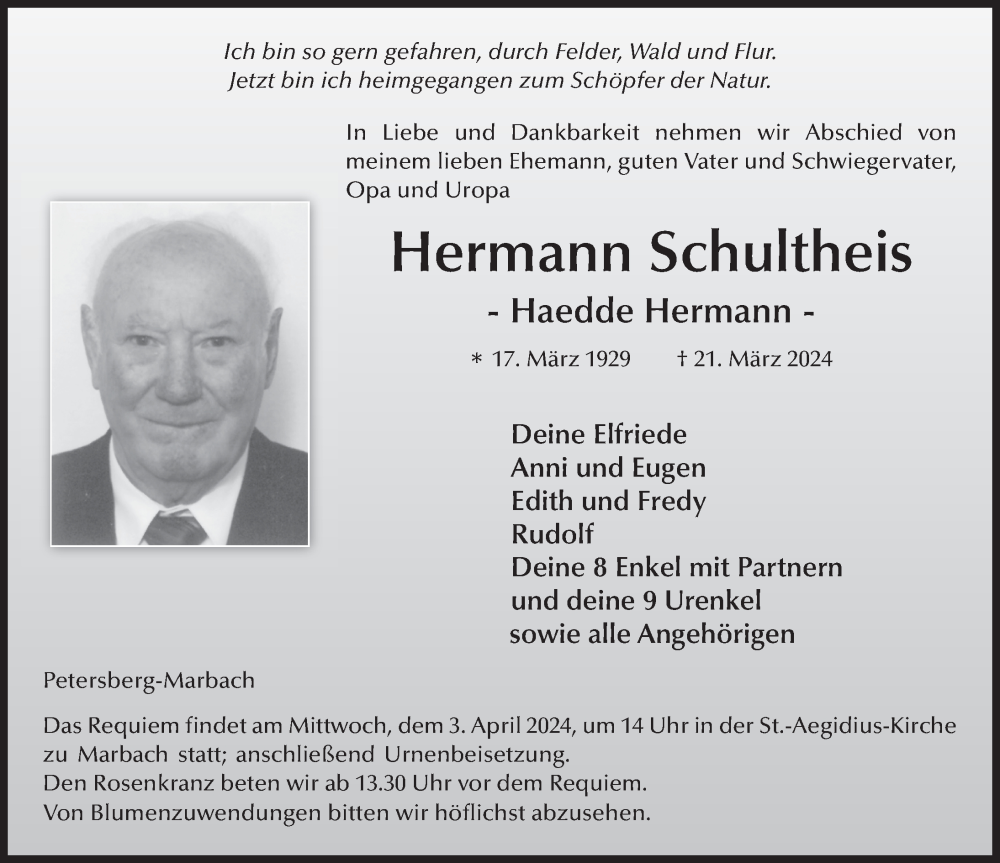 Hier finden Sie alle Traueranzeigen aus der Zeitung, die bisher für Hermann Schultheis erschienen sind. Weitere Traueranzeigen, die in der Zeitung erscheinen, werden hier ebenfalls aufgelistet
