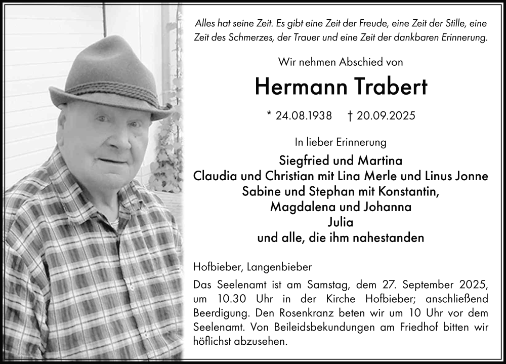 Hier finden Sie alle Traueranzeigen aus der Zeitung, die bisher für Hermann Trabert erschienen sind. Weitere Traueranzeigen, die in der Zeitung erscheinen, werden hier ebenfalls aufgelistet
