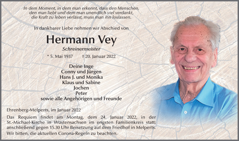 Hier finden Sie alle Traueranzeigen aus der Zeitung, die bisher für Hermann Vey erschienen sind. Weitere Traueranzeigen, die in der Zeitung erscheinen, werden hier ebenfalls aufgelistet