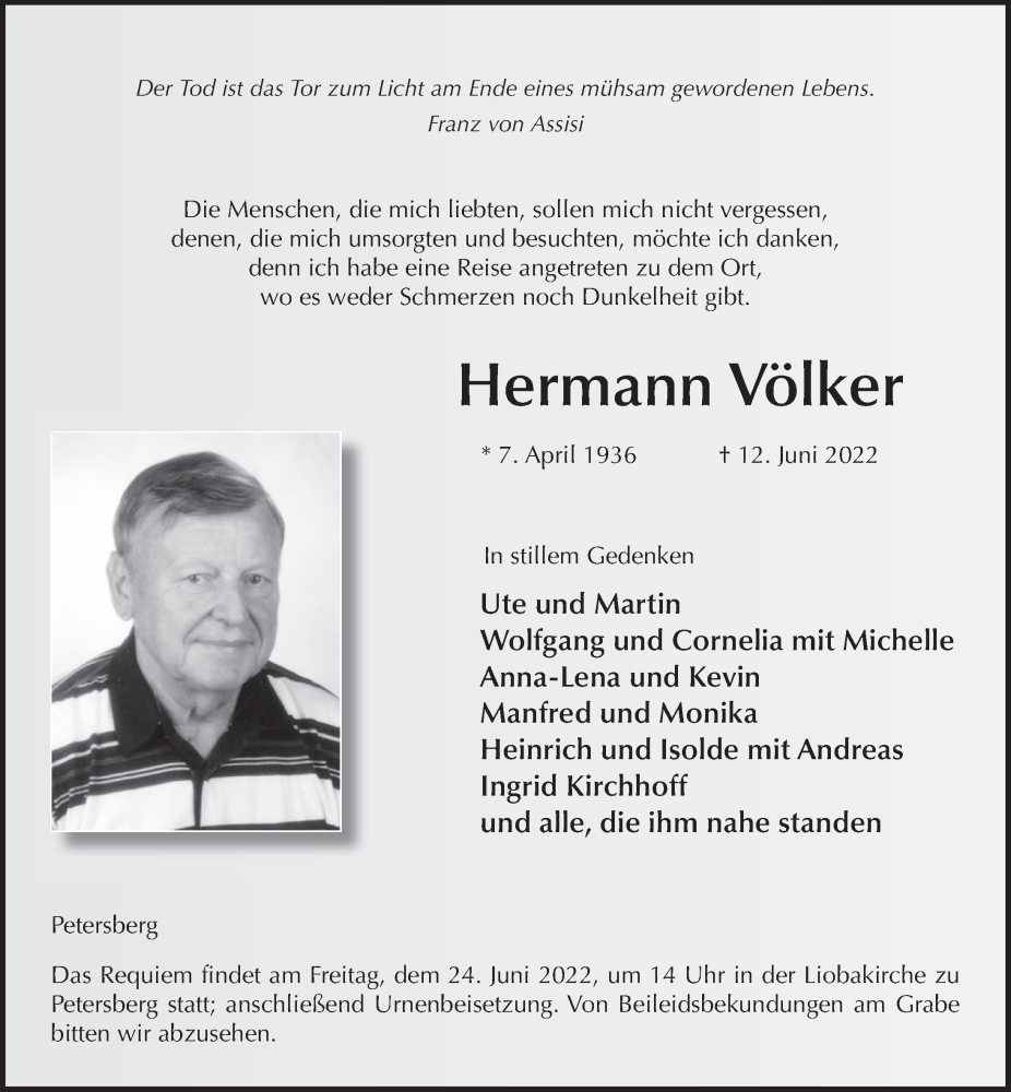 Hier finden Sie alle Traueranzeigen aus der Zeitung, die bisher für Hermann Völker erschienen sind. Weitere Traueranzeigen, die in der Zeitung erscheinen, werden hier ebenfalls aufgelistet
