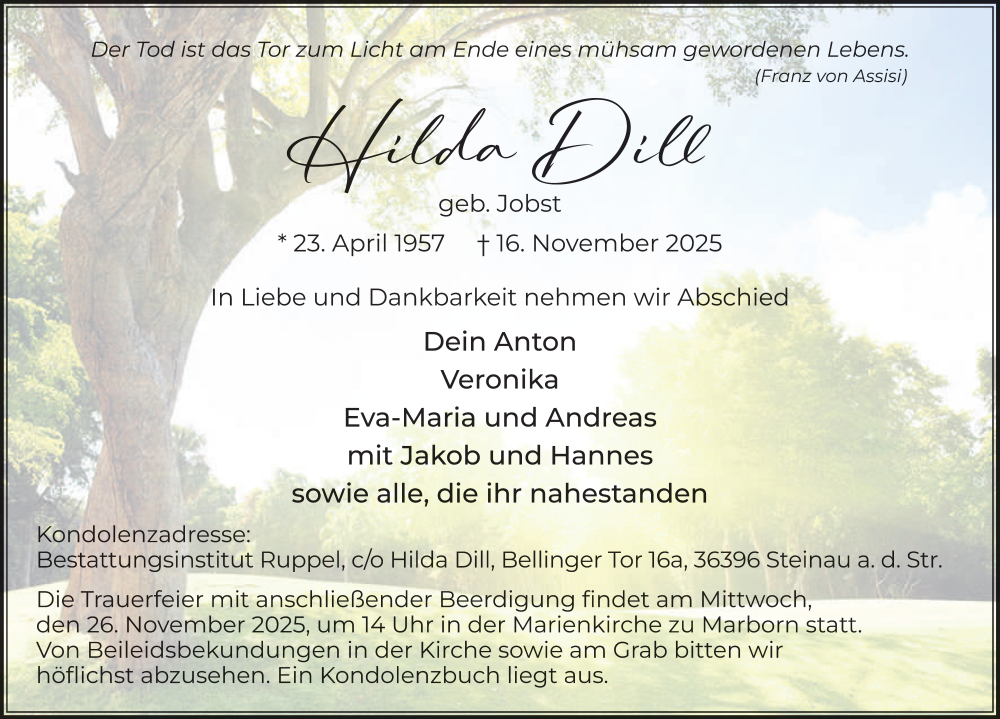Hier finden Sie alle Traueranzeigen aus der Zeitung, die bisher für Hilda Dill erschienen sind. Weitere Traueranzeigen, die in der Zeitung erscheinen, werden hier ebenfalls aufgelistet