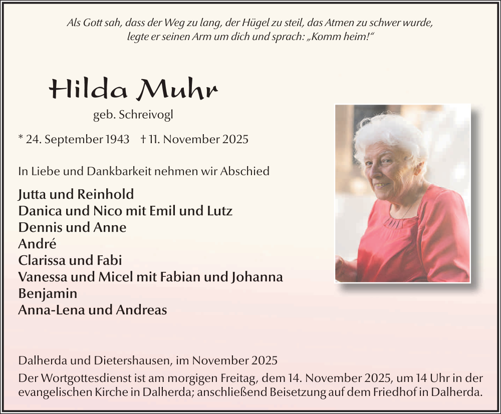 Hier finden Sie alle Traueranzeigen aus der Zeitung, die bisher für Hilda Muhr erschienen sind. Weitere Traueranzeigen, die in der Zeitung erscheinen, werden hier ebenfalls aufgelistet