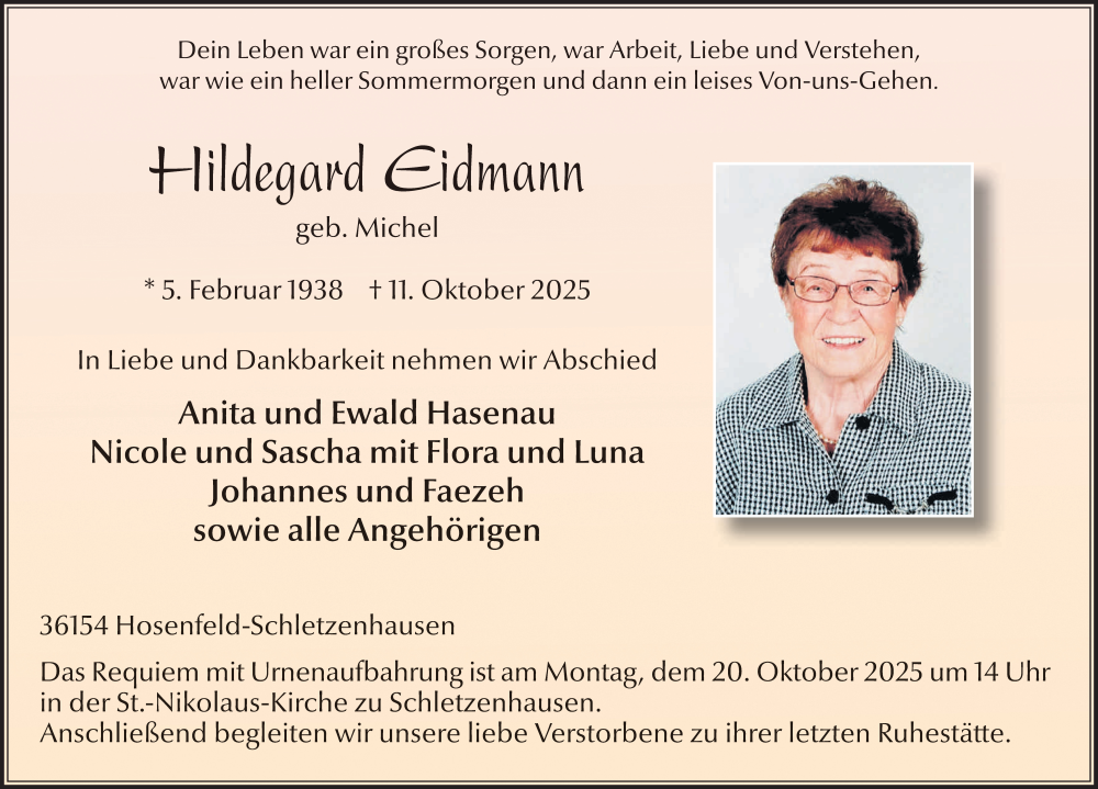 Hier finden Sie alle Traueranzeigen aus der Zeitung, die bisher für Hildegard Eidmann erschienen sind. Weitere Traueranzeigen, die in der Zeitung erscheinen, werden hier ebenfalls aufgelistet