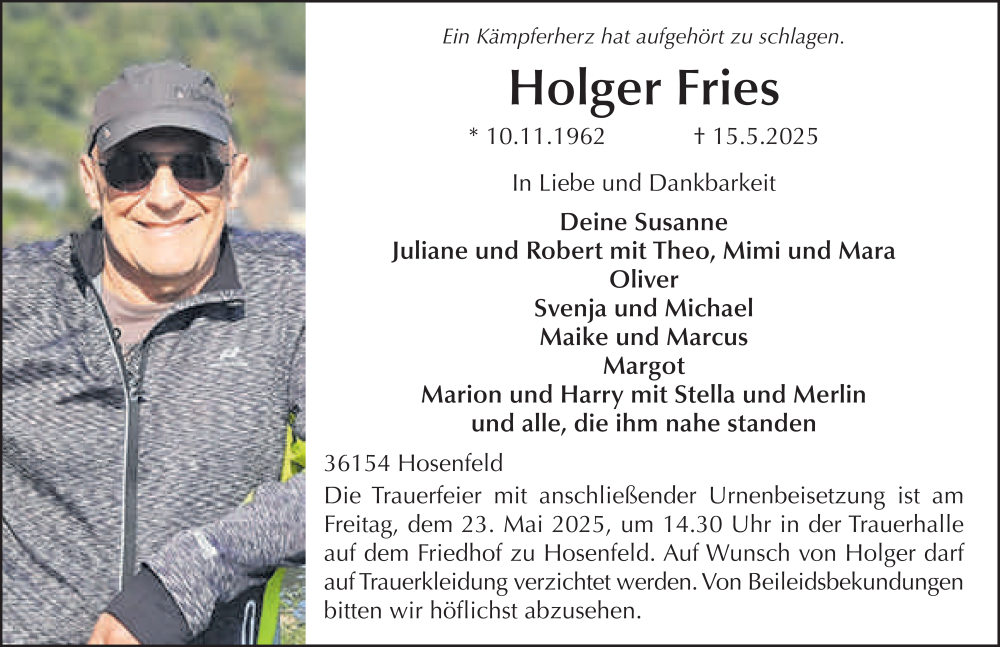 Hier finden Sie alle Traueranzeigen aus der Zeitung, die bisher für Holger Fries erschienen sind. Weitere Traueranzeigen, die in der Zeitung erscheinen, werden hier ebenfalls aufgelistet