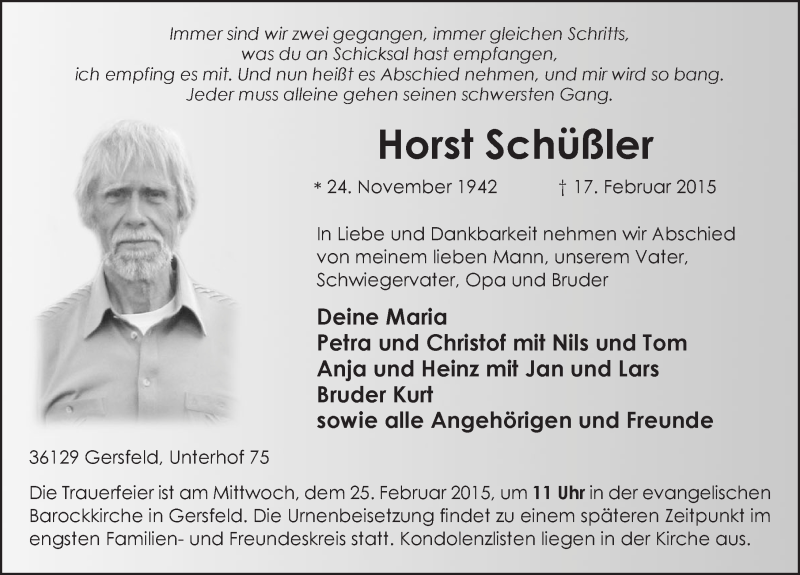 Hier finden Sie alle Traueranzeigen aus der Zeitung, die bisher für Horst Schüßler erschienen sind. Weitere Traueranzeigen, die in der Zeitung erscheinen, werden hier ebenfalls aufgelistet