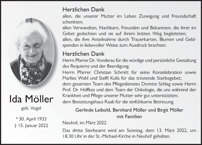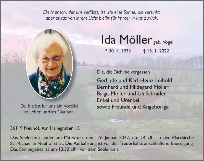 Hier finden Sie alle Traueranzeigen aus der Zeitung, die bisher für Ida Möller erschienen sind. Weitere Traueranzeigen, die in der Zeitung erscheinen, werden hier ebenfalls aufgelistet