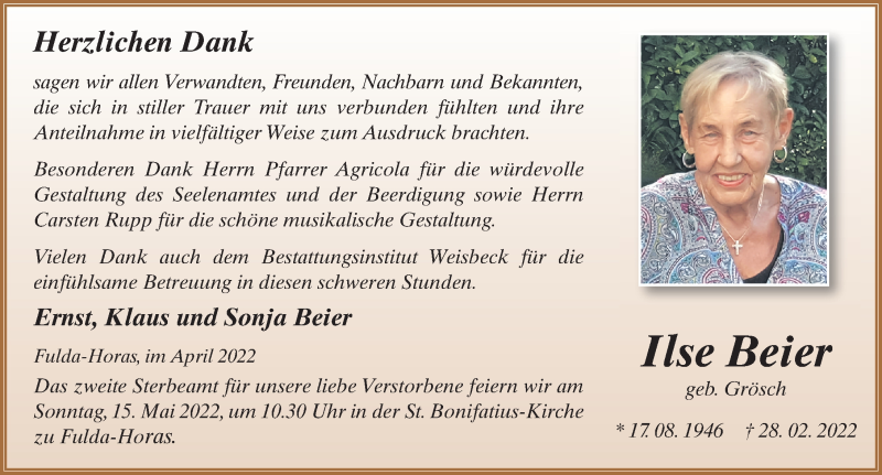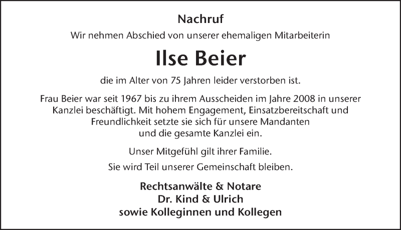 Hier finden Sie alle Traueranzeigen aus der Zeitung, die bisher für Ilse Beier erschienen sind. Weitere Traueranzeigen, die in der Zeitung erscheinen, werden hier ebenfalls aufgelistet