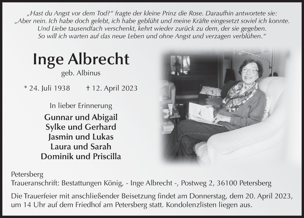 Hier finden Sie alle Traueranzeigen aus der Zeitung, die bisher für Inge Albrecht erschienen sind. Weitere Traueranzeigen, die in der Zeitung erscheinen, werden hier ebenfalls aufgelistet
