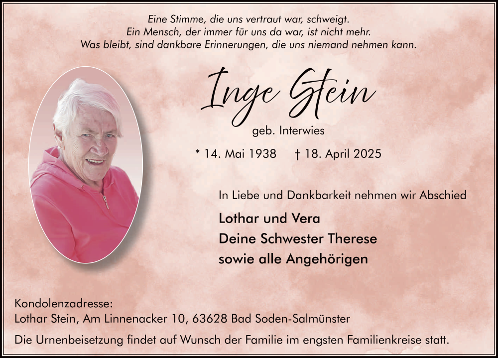 Hier finden Sie alle Traueranzeigen aus der Zeitung, die bisher für Inge Stein erschienen sind. Weitere Traueranzeigen, die in der Zeitung erscheinen, werden hier ebenfalls aufgelistet
