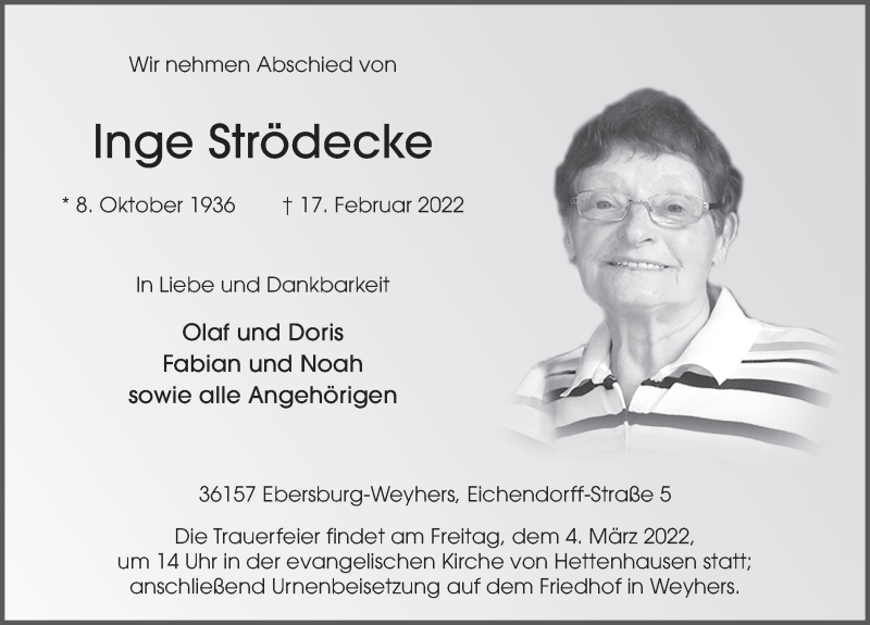 Hier finden Sie alle Traueranzeigen aus der Zeitung, die bisher für Inge Strödecke erschienen sind. Weitere Traueranzeigen, die in der Zeitung erscheinen, werden hier ebenfalls aufgelistet