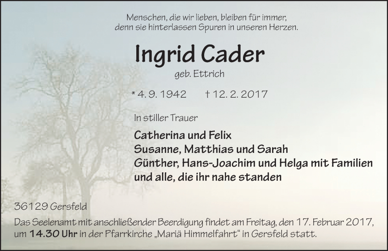 Hier finden Sie alle Traueranzeigen aus der Zeitung, die bisher für Ingrid Cader erschienen sind. Weitere Traueranzeigen, die in der Zeitung erscheinen, werden hier ebenfalls aufgelistet