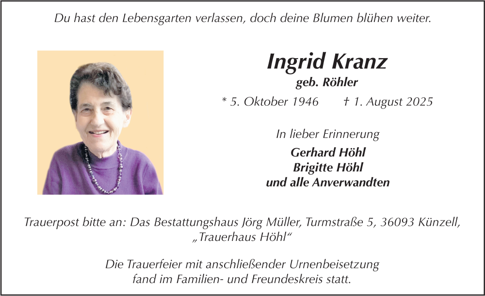 Hier finden Sie alle Traueranzeigen aus der Zeitung, die bisher für Ingrid Kranz erschienen sind. Weitere Traueranzeigen, die in der Zeitung erscheinen, werden hier ebenfalls aufgelistet