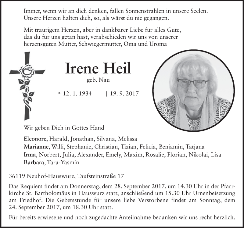 Hier finden Sie alle Traueranzeigen aus der Zeitung, die bisher für Irene Heil erschienen sind. Weitere Traueranzeigen, die in der Zeitung erscheinen, werden hier ebenfalls aufgelistet