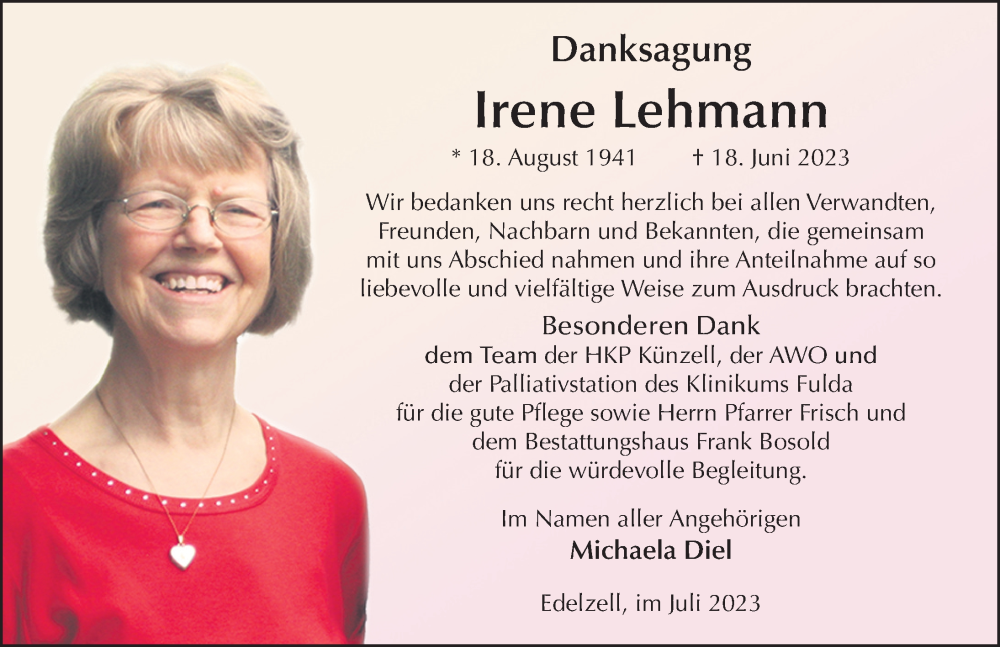 Hier finden Sie alle Traueranzeigen aus der Zeitung, die bisher für Irene Lehmann erschienen sind. Weitere Traueranzeigen, die in der Zeitung erscheinen, werden hier ebenfalls aufgelistet