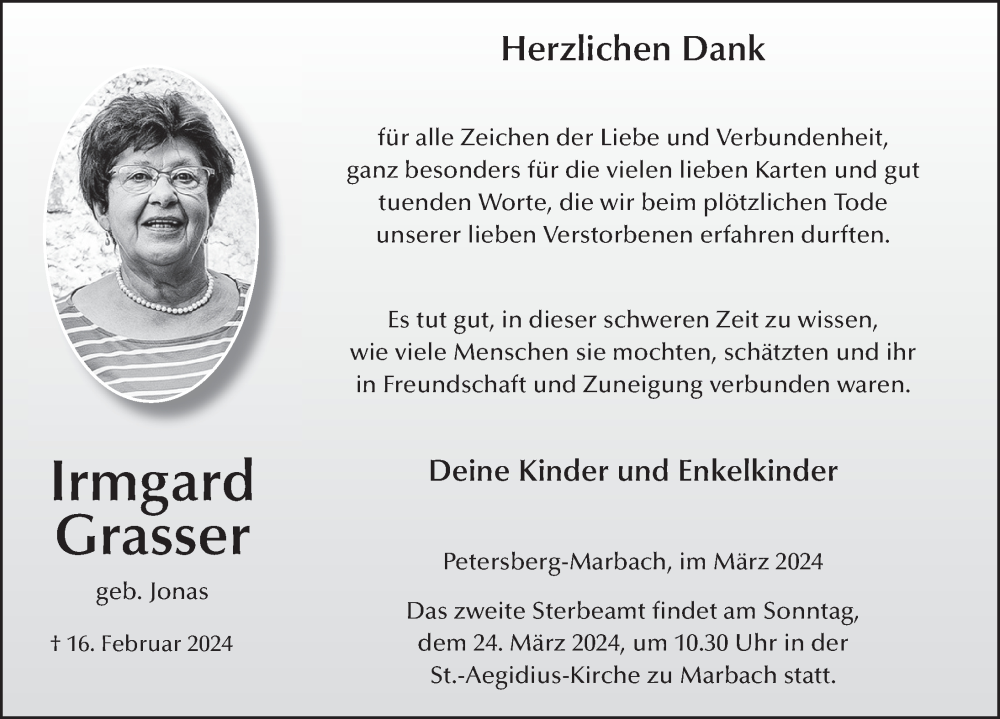 Hier finden Sie alle Traueranzeigen aus der Zeitung, die bisher für Irmgard Grasser erschienen sind. Weitere Traueranzeigen, die in der Zeitung erscheinen, werden hier ebenfalls aufgelistet