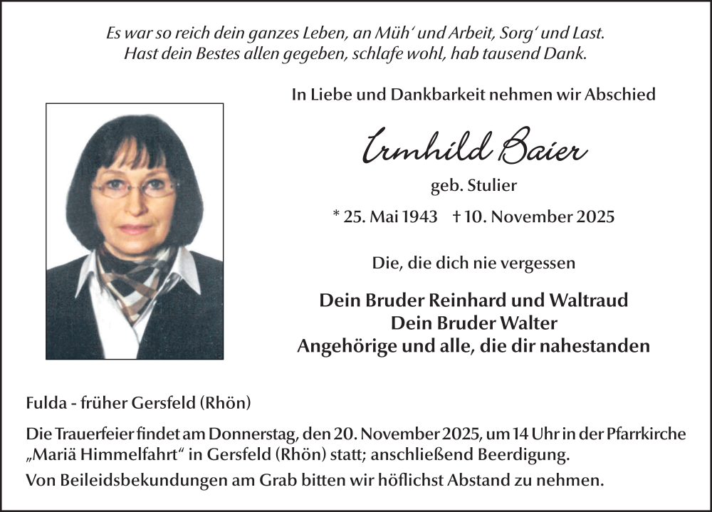 Hier finden Sie alle Traueranzeigen aus der Zeitung, die bisher für Irmhild Baier erschienen sind. Weitere Traueranzeigen, die in der Zeitung erscheinen, werden hier ebenfalls aufgelistet