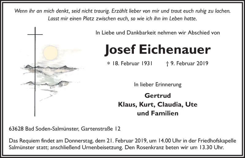 Hier finden Sie alle Traueranzeigen aus der Zeitung, die bisher für Josef Eichenauer erschienen sind. Weitere Traueranzeigen, die in der Zeitung erscheinen, werden hier ebenfalls aufgelistet