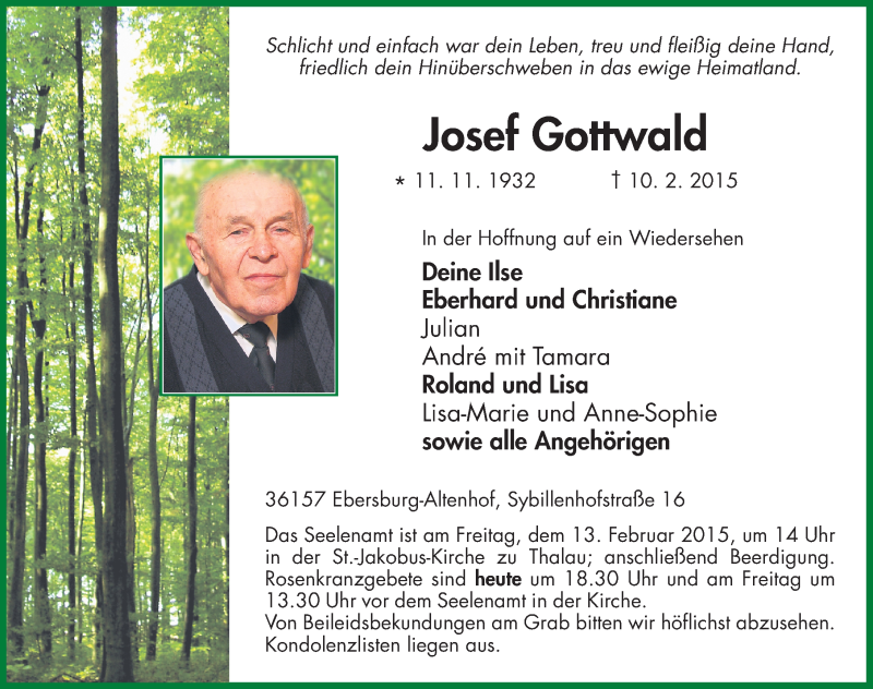 Hier finden Sie alle Traueranzeigen aus der Zeitung, die bisher für Josef Gottwald erschienen sind. Weitere Traueranzeigen, die in der Zeitung erscheinen, werden hier ebenfalls aufgelistet