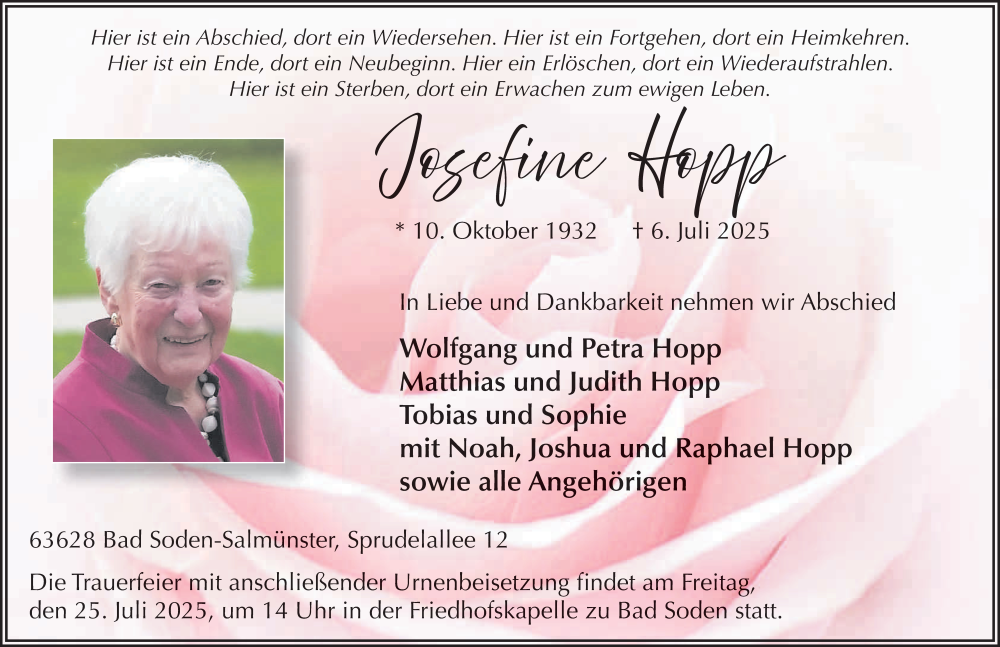 Hier finden Sie alle Traueranzeigen aus der Zeitung, die bisher für Josefine Hopp erschienen sind. Weitere Traueranzeigen, die in der Zeitung erscheinen, werden hier ebenfalls aufgelistet
