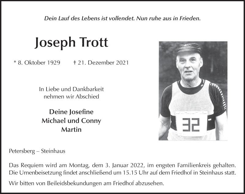 Hier finden Sie alle Traueranzeigen aus der Zeitung, die bisher für Joseph Trott erschienen sind. Weitere Traueranzeigen, die in der Zeitung erscheinen, werden hier ebenfalls aufgelistet