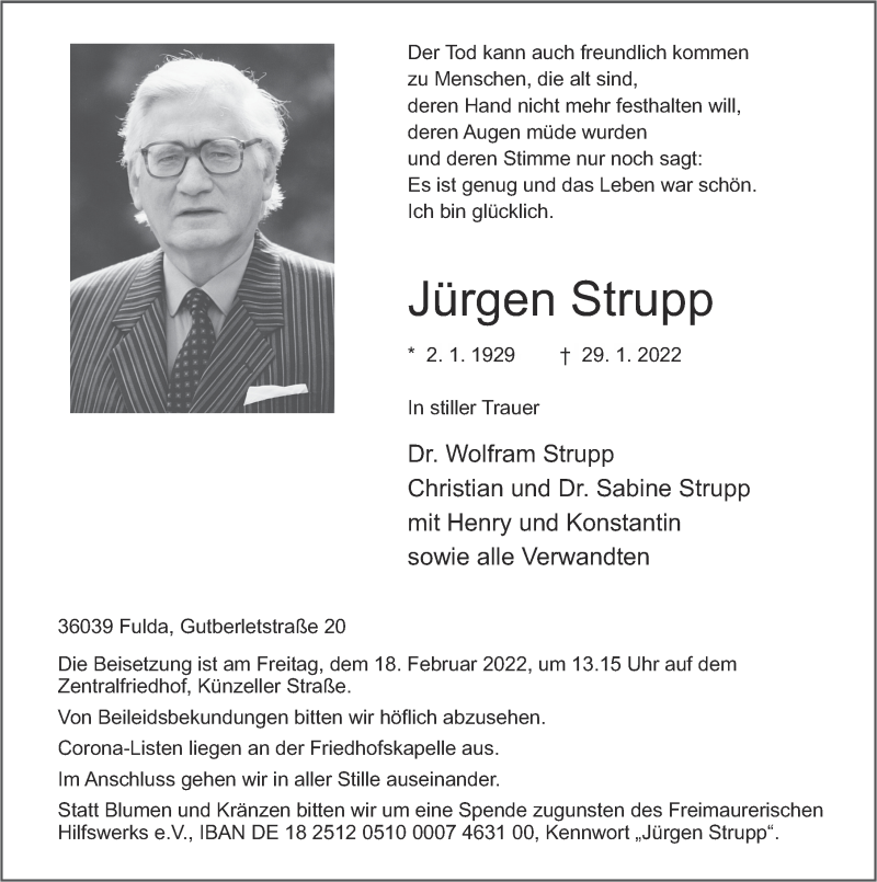 Hier finden Sie alle Traueranzeigen aus der Zeitung, die bisher für Jürgen Strupp erschienen sind. Weitere Traueranzeigen, die in der Zeitung erscheinen, werden hier ebenfalls aufgelistet