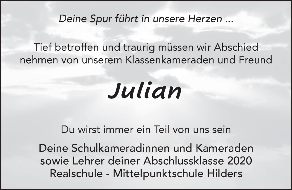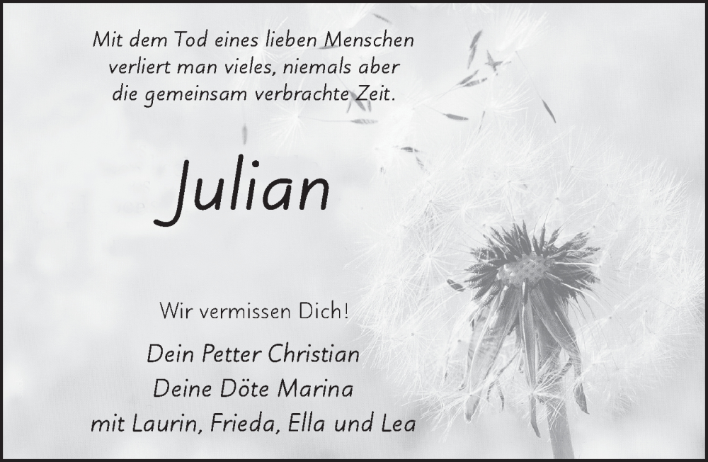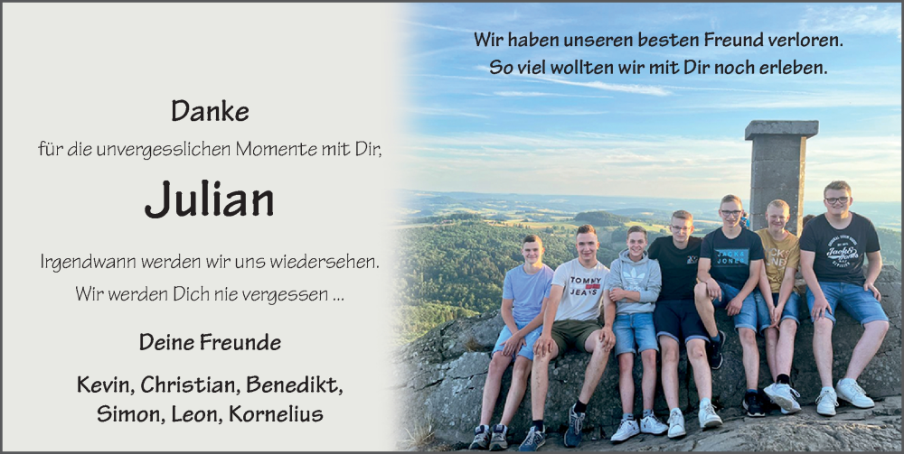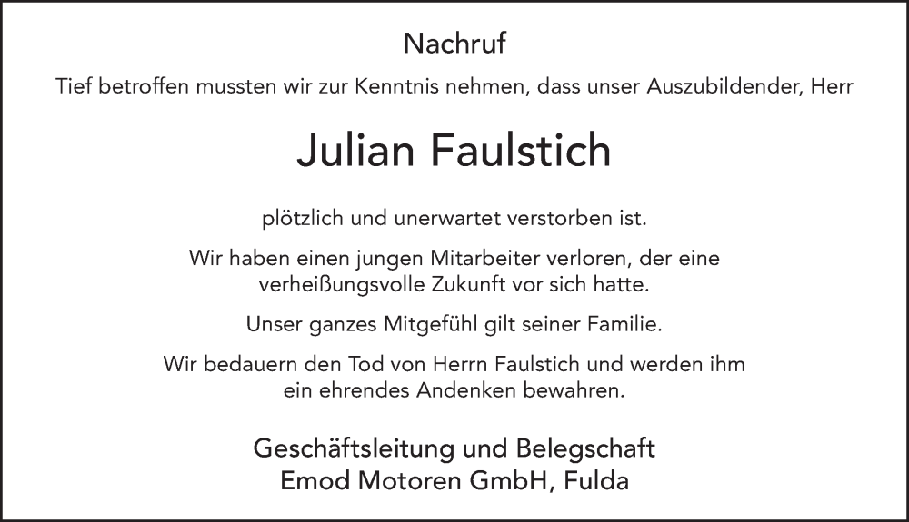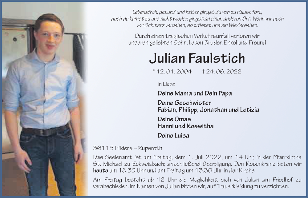 Hier finden Sie alle Traueranzeigen aus der Zeitung, die bisher für Julian Faulstich erschienen sind. Weitere Traueranzeigen, die in der Zeitung erscheinen, werden hier ebenfalls aufgelistet