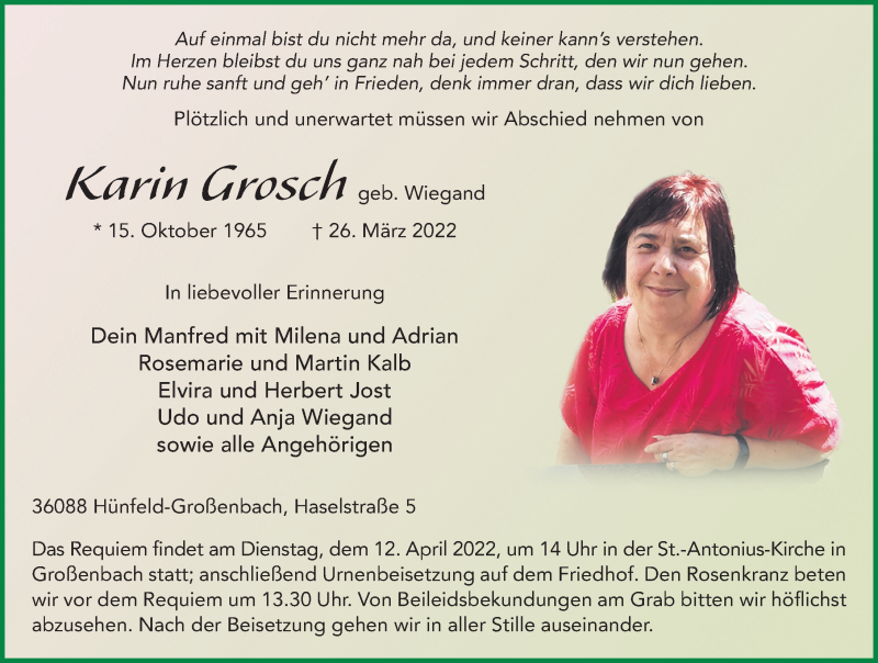 Hier finden Sie alle Traueranzeigen aus der Zeitung, die bisher für Karin Grosch erschienen sind. Weitere Traueranzeigen, die in der Zeitung erscheinen, werden hier ebenfalls aufgelistet
