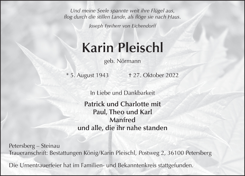 Hier finden Sie alle Traueranzeigen aus der Zeitung, die bisher für Karin Pleischl erschienen sind. Weitere Traueranzeigen, die in der Zeitung erscheinen, werden hier ebenfalls aufgelistet
