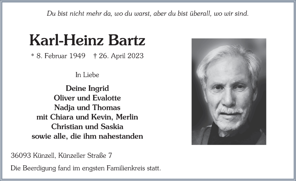 Hier finden Sie alle Traueranzeigen aus der Zeitung, die bisher für Karl-Heinz Bartz erschienen sind. Weitere Traueranzeigen, die in der Zeitung erscheinen, werden hier ebenfalls aufgelistet