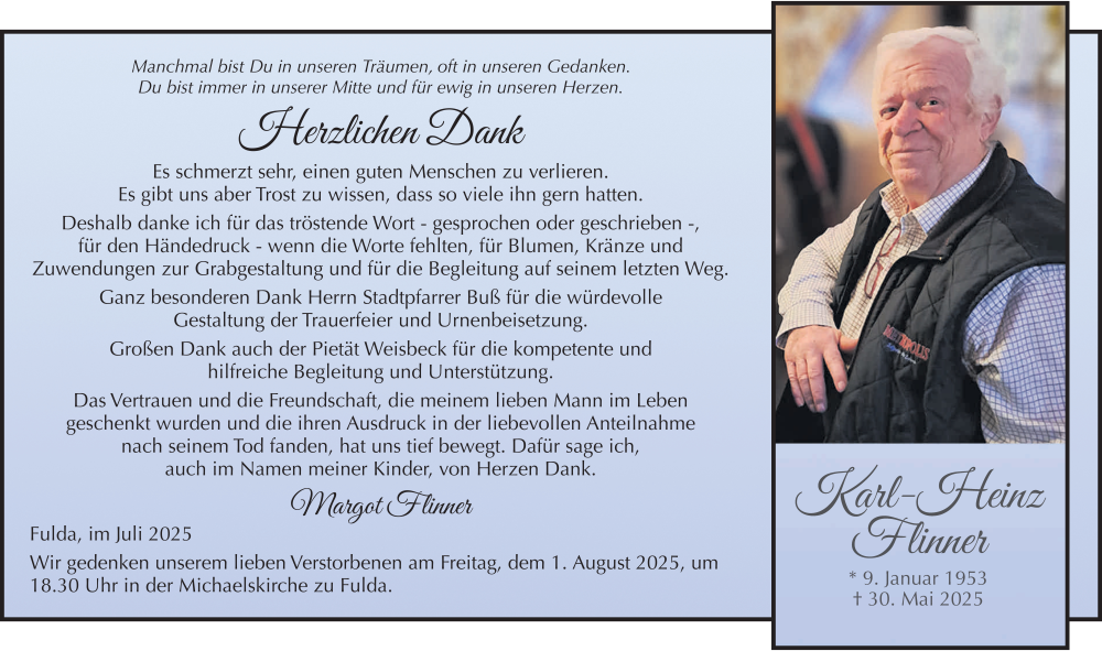 Hier finden Sie alle Traueranzeigen aus der Zeitung, die bisher für Karl-Heinz Flinner erschienen sind. Weitere Traueranzeigen, die in der Zeitung erscheinen, werden hier ebenfalls aufgelistet