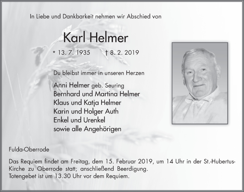 Hier finden Sie alle Traueranzeigen aus der Zeitung, die bisher für Karl Helmer erschienen sind. Weitere Traueranzeigen, die in der Zeitung erscheinen, werden hier ebenfalls aufgelistet
