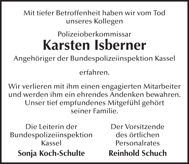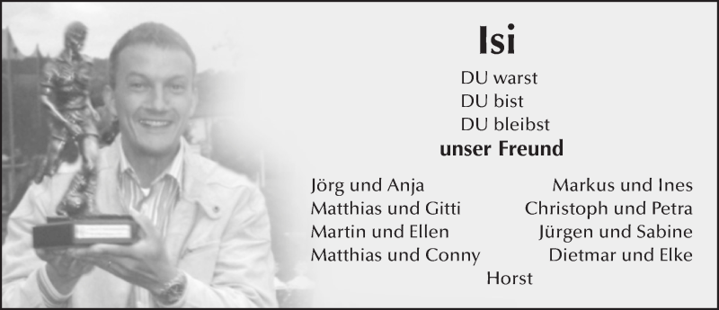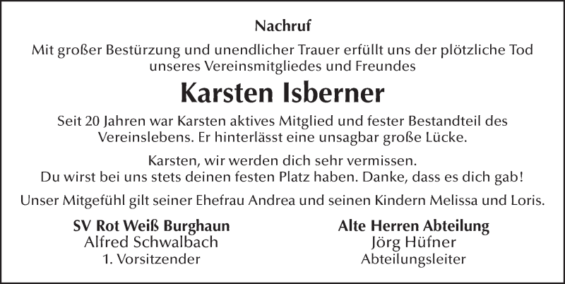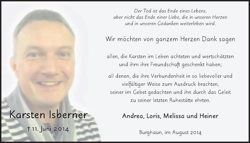 Hier finden Sie alle Traueranzeigen aus der Zeitung, die bisher für Karsten Isberner erschienen sind. Weitere Traueranzeigen, die in der Zeitung erscheinen, werden hier ebenfalls aufgelistet