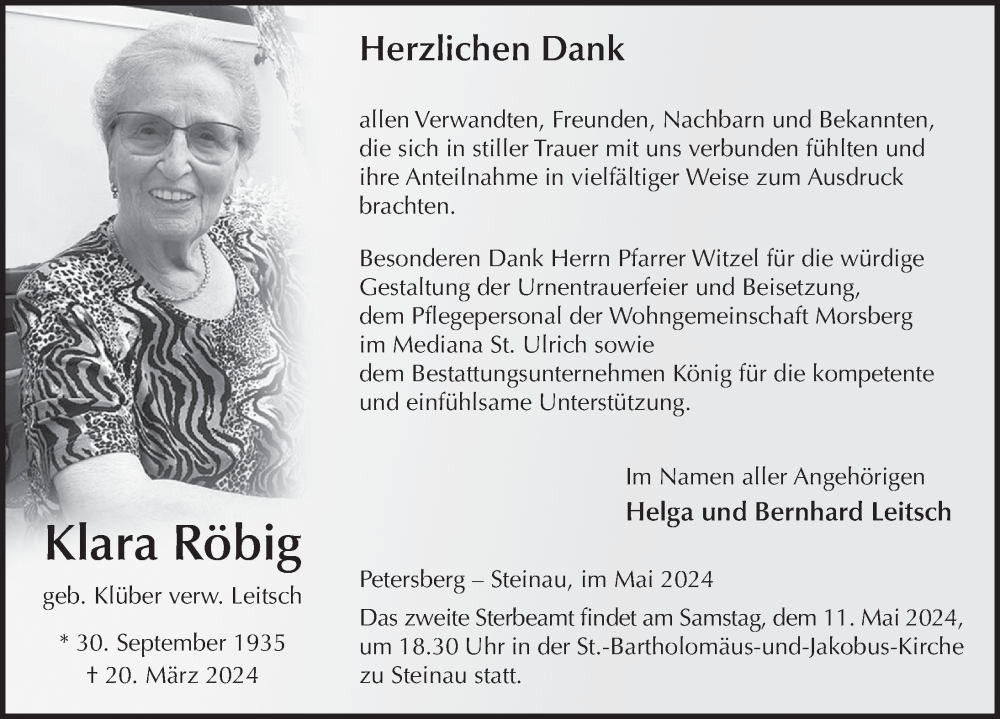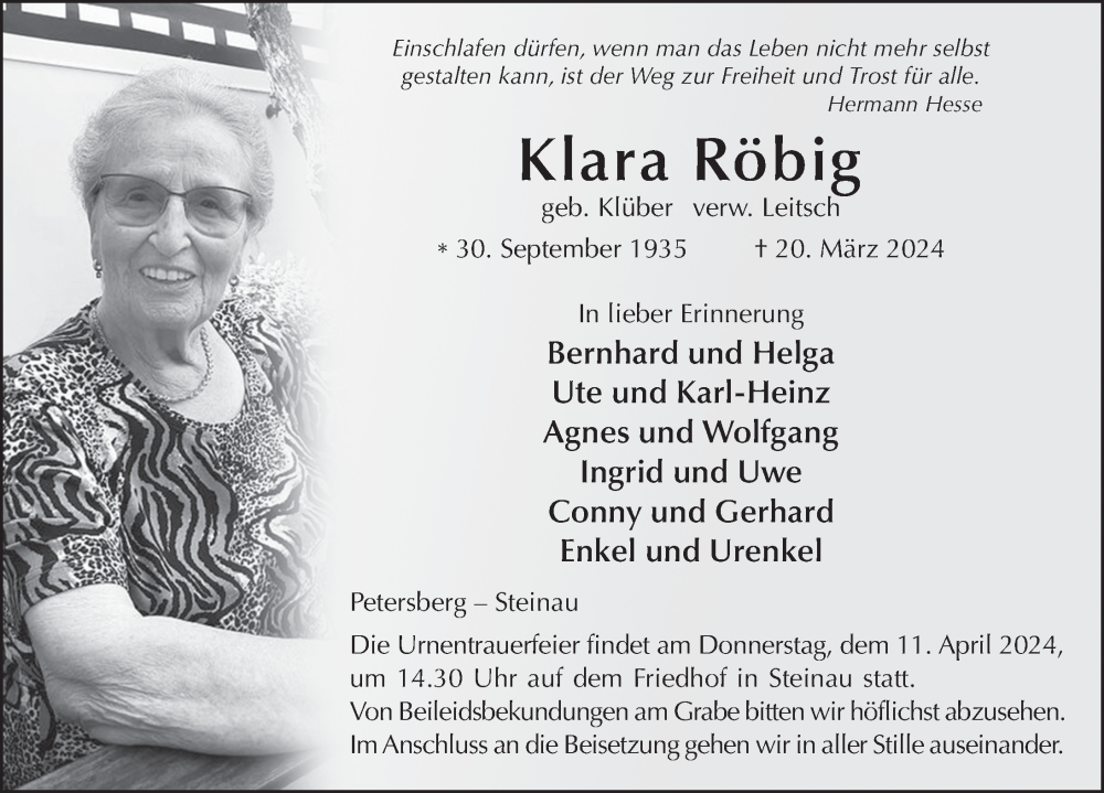 Hier finden Sie alle Traueranzeigen aus der Zeitung, die bisher für Klara Röbig erschienen sind. Weitere Traueranzeigen, die in der Zeitung erscheinen, werden hier ebenfalls aufgelistet