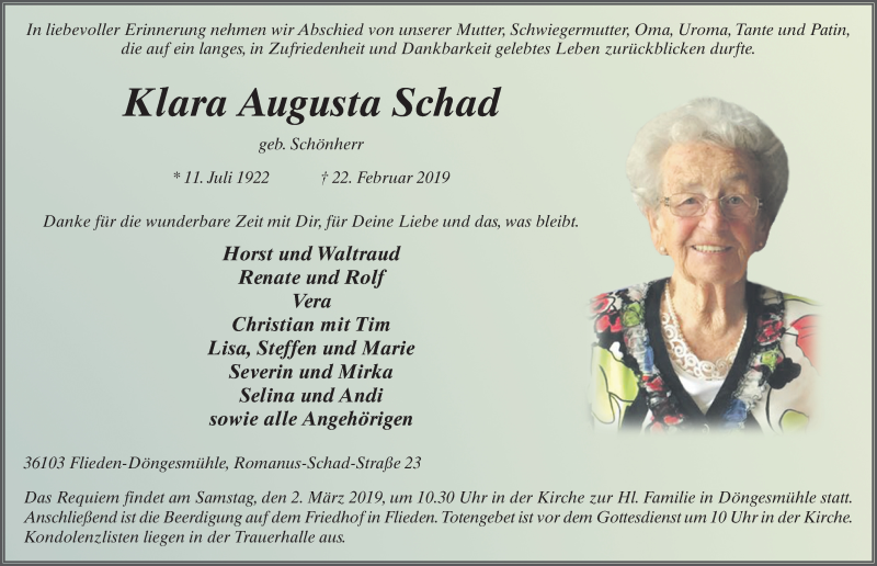 Hier finden Sie alle Traueranzeigen aus der Zeitung, die bisher für Klara Augusta Schad erschienen sind. Weitere Traueranzeigen, die in der Zeitung erscheinen, werden hier ebenfalls aufgelistet