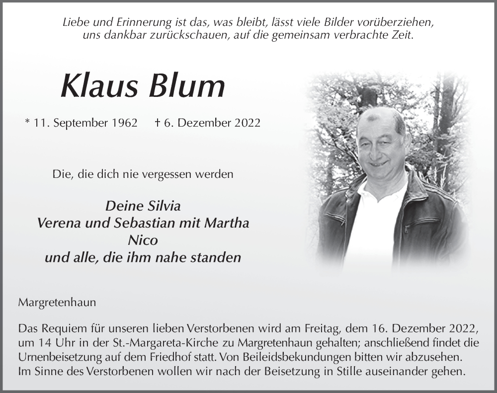 Hier finden Sie alle Traueranzeigen aus der Zeitung, die bisher für Klaus Blum erschienen sind. Weitere Traueranzeigen, die in der Zeitung erscheinen, werden hier ebenfalls aufgelistet