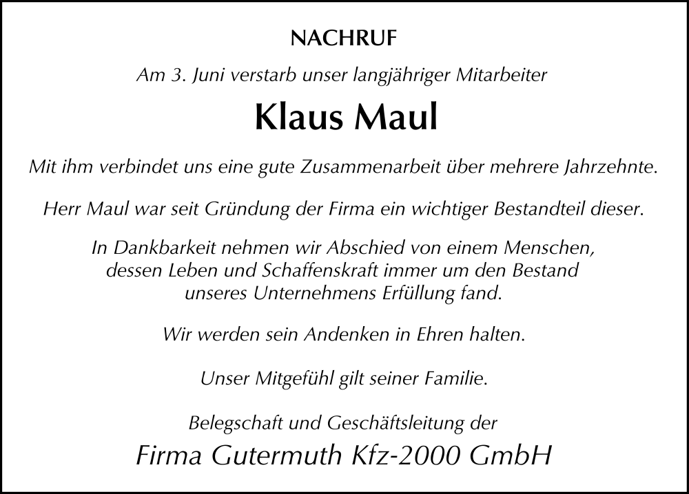 Hier finden Sie alle Traueranzeigen aus der Zeitung, die bisher für Klaus Maul erschienen sind. Weitere Traueranzeigen, die in der Zeitung erscheinen, werden hier ebenfalls aufgelistet