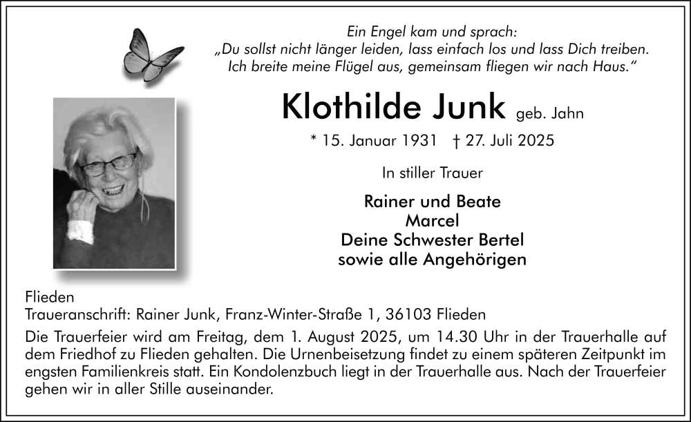 Hier finden Sie alle Traueranzeigen aus der Zeitung, die bisher für Klothilde Junk erschienen sind. Weitere Traueranzeigen, die in der Zeitung erscheinen, werden hier ebenfalls aufgelistet