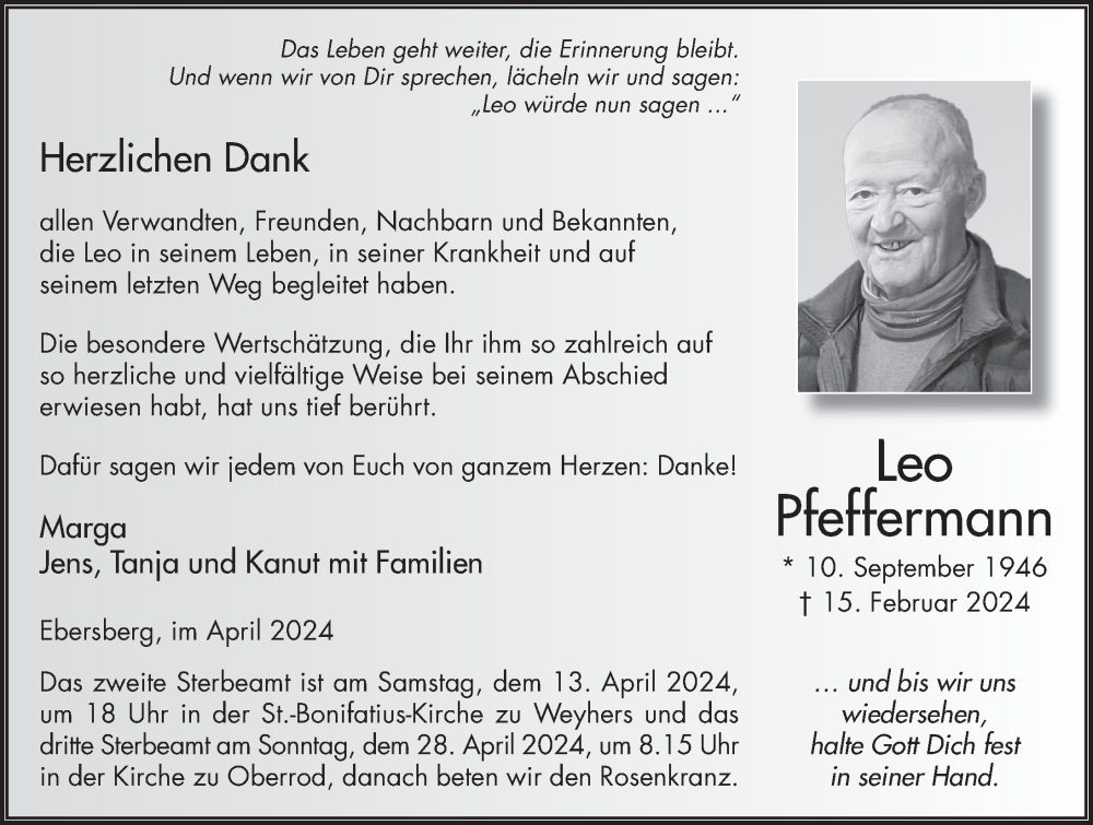 Hier finden Sie alle Traueranzeigen aus der Zeitung, die bisher für Leo Pfeffermann erschienen sind. Weitere Traueranzeigen, die in der Zeitung erscheinen, werden hier ebenfalls aufgelistet
