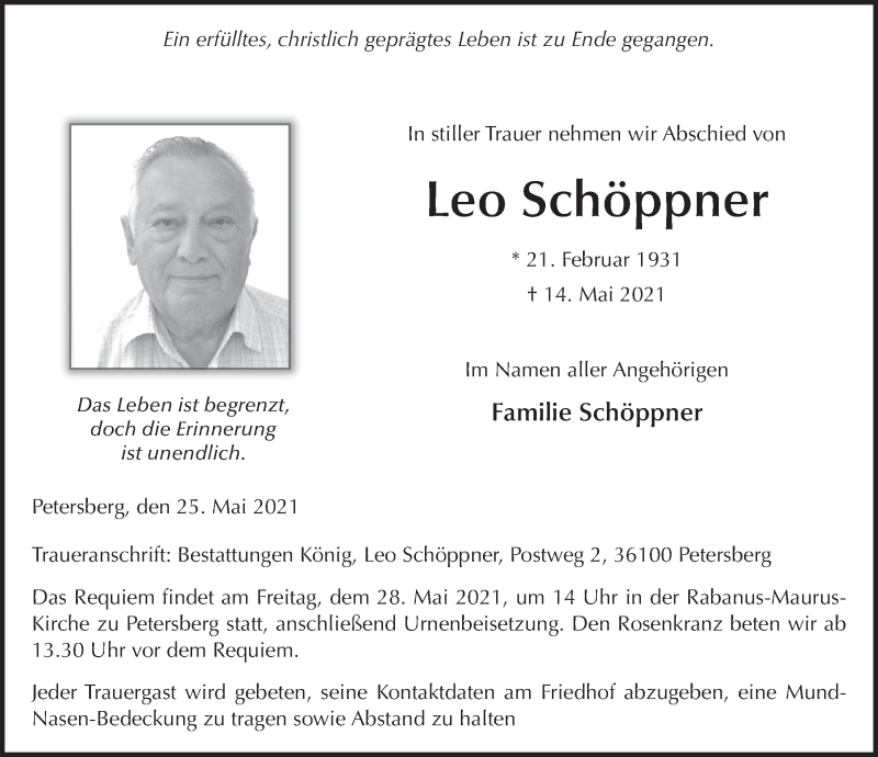 Hier finden Sie alle Traueranzeigen aus der Zeitung, die bisher für Leo Schöppner erschienen sind. Weitere Traueranzeigen, die in der Zeitung erscheinen, werden hier ebenfalls aufgelistet