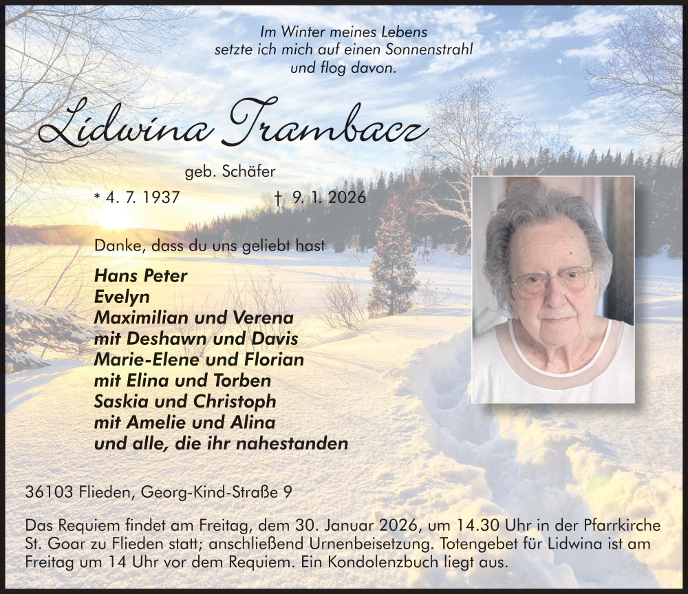 Hier finden Sie alle Traueranzeigen aus der Zeitung, die bisher für Lidwina Trambacz erschienen sind. Weitere Traueranzeigen, die in der Zeitung erscheinen, werden hier ebenfalls aufgelistet