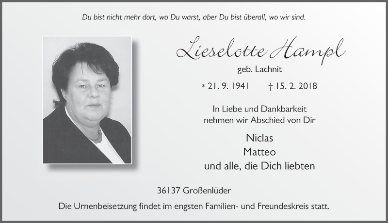 Hier finden Sie alle Traueranzeigen aus der Zeitung, die bisher für Lieselotte Hampl erschienen sind. Weitere Traueranzeigen, die in der Zeitung erscheinen, werden hier ebenfalls aufgelistet
