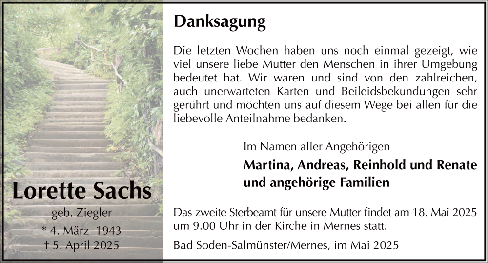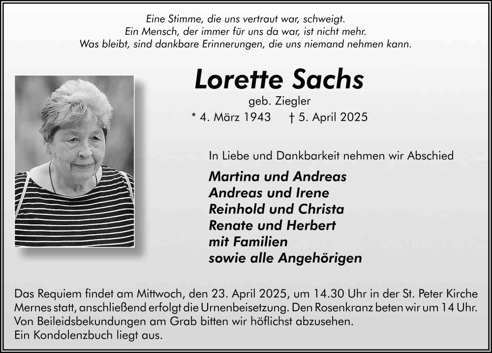 Hier finden Sie alle Traueranzeigen aus der Zeitung, die bisher für Lorette Sachs erschienen sind. Weitere Traueranzeigen, die in der Zeitung erscheinen, werden hier ebenfalls aufgelistet