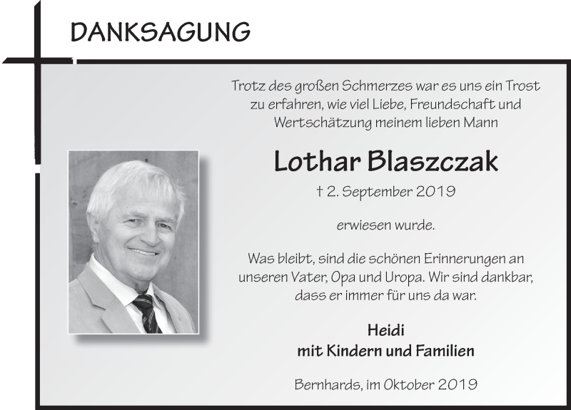 Hier finden Sie alle Traueranzeigen aus der Zeitung, die bisher für Lothar Blaszczak erschienen sind. Weitere Traueranzeigen, die in der Zeitung erscheinen, werden hier ebenfalls aufgelistet
